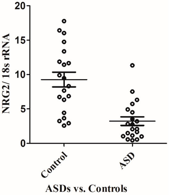 Scatter plot of the NRG2 mRNA level as normalized by 18S rRNA in 20 patients with Autism Spectrum Disorder (ASD) and 20 control subjects. The horizontal line indicates the mean of NRG2 transcript. The average expression level of the NRG2 gene transcript in patients with ASD (3.23 ± 2.80) was significantly lower than that of control subjects (9.27 ± 4.78), p < 0.001.