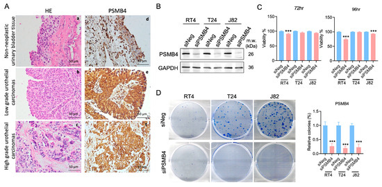 RT4, T24, and J82 human bladder cancer cells were seeded in 6-well plates at 3 × 105 cells per well. The cells were transfected with siNegative control (siNeg, siGENOME Control Pool 50 nM, Catalog ID:D-001206-13-05; Dharmacon Horizon Discovery, Cambridge, UK) or siPSMB4 (Cat. No. M-011362-00-0010) using Lipofectamine 3000 reagent (Cat. No. L3000001, Thermo Fisher Scientific, Waltham, MA, USA). The cells were used for further experiments after 72 h of transfection.
