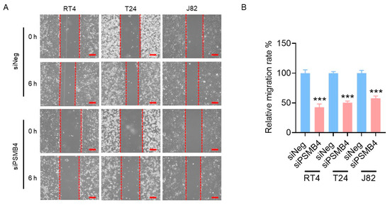 The migration ability of bladder cancer cells after PSMB4 silencing. (A) The migration ability of RT4, T24, and J82 human bladder cancer cells was measured via a wound healing assay. Cells were incubated with siPSMB4 for 72 h; then, wounds were created by scratching the cell layer with a P200 pipette tip before observing them for 6 h. Scale bar = 200 μm. (B) Quantification of the relative migration rate. Data are presented as the mean ± SEM (n = 5). *** p < 0.001 compared to the siRNA negative control group, determined by unpaired t-test with the Mann–Whitney test.