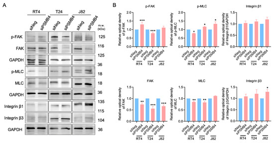 The levels of migration-related proteins in bladder cancer cells after PSMB4 knockdown. (A) The protein levels of FAK, p-FAK, integrin β1, integrin β3, MLC, and p-MLC in RT4, T24, and J82 cells after treatment with siPSMB4 for 72 h were measured by Western blotting. We used GAPDH as the loading control. (B) The relative quantification of the aforementioned proteins. Data are presented as the mean ± SEM (n = 6). * p < 0.05, ** p < 0.01, and *** p < 0.001 compared to the siRNA negative control group, determined by unpaired t-test with the Mann–Whitney test.