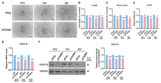 The effect of PSMB4 knockdown on HUVEC angiogenesis. (A) The conditioned medium of RT4, T24, and J82 cells transfected with siPSMB4 was collected. HUVECs were cultured with these conditioned media for 6 h. The tube formation ability was evaluated. Scale bar = 200 μm. (B,C) The length and branching of formed tubes were analyzed (n = 5). (D) The VEGF protein content in the conditioned medium of RT4, T24, and J82 cells after treatment with siPSMB4 was measured with an ELISA kit (n = 4). (E) The mRNA levels of VEGF-B in RT4, T24, and J82 cells after treatment with siPSMB4 for 72 h were measured via real-time PCR (n = 4). (F) VEGF-B protein expression after siPSMB4 transfection for 72 h in RT4, T24, and J82 cells (n = 7). Data are presented as the mean ± SEM. * p < 0.05, ** p < 0.01, and *** p < 0.001 compared to the siRNA negative control group, determined by unpaired t-test with the Mann–Whitney test.