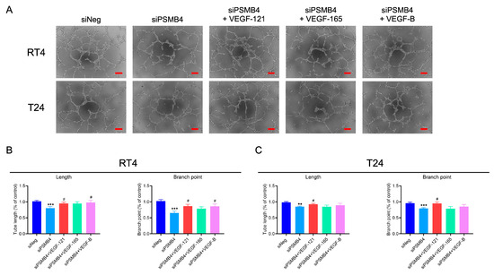 The role of VEGF factors in PSMB4 knockdown in HUVEC angiogenesis. (A) The conditioned media from RT4 (n = 7) and T24 (n =11) cells transfected with siPSMB4 were collected. The angiogenesis factors of VEFG-121, VEGF-165, and VEGF-B (2 μg/mL) were added into the condition media. Tube formation was observed after 6 h. (B,C) The length and branching of formed tubes in RT4 and T24 cells were analyzed. Scale bar = 200 μm. Data are presented as the mean ± SEM. ** p < 0.01, and *** p < 0.001 compared to the siRNA negative control group. # p < 0.05 compared to the siPSMB4 control group, determined by unpaired t-test with the Mann–Whitney test.