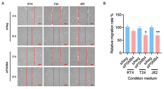 The effect of PSMB4 knockdown on HUVEC migration. (A) The conditioned media of RT4, T24, and J82 cells transfected with siPSMB4 were collected. HUVECs were incubated with conditioned medium; then, wounds were created in the cell layer by scraping with a P200 pipette tip before observing them for 6 h. The migration ability of HUVECs was measured using a wound healing assay. Scale bar = 200 μm. (B) The quantitative relative migration rate is shown. Data are presented as the mean ± SEM (n = 11). * p < 0.05 and ** p < 0.01 compared to the siRNA negative control group, determined by unpaired t-test with the Mann–Whitney test.