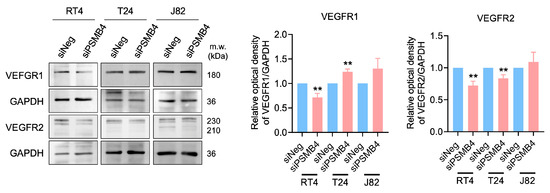 The expression of angiogenesis-related proteins in HUVECs after the silencing of PSMB4. The conditioned media of RT4, T24, and J82 cells transfected with siPSMB4 were collected. HUVECs were cultured with these conditioned media for 6 h. The protein levels of VEGFR1 and VEGFR2 in HUVECs after treatment with conditioned medium were measured by Western blotting. GAPDH was used as the loading control. Data are presented as the mean ± SEM (n = 5). ** p < 0.01 compared to the siRNA negative control group, determined by unpaired t-test with the Mann–Whitney test.