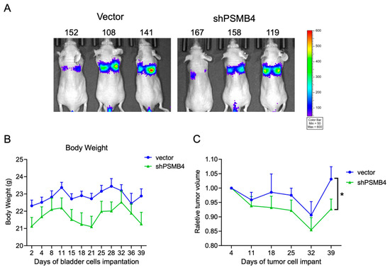 To clarify the role of PSMB4 in vivo, we established a bladder cancer metastasis model in nude mice by intravenous injection to evaluate the effect of PSMB4 knockdown on metastasis (Figure 8A). Body weight fluctuations were unaffected in each group (Figure 8B). After 39 days, the relative volumes of lung tumors were smaller in the shPSMB4 group than in the vector control group (Figure 8C). These results suggest that PSMB4 may regulate bladder cancer progression, but the detailed mechanism still needs to be confirmed.