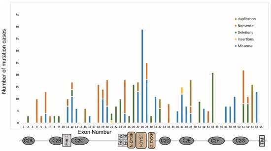 - Blandin, G.; Beroud, C.; Labelle, V.; Nguyen, K.; Wein, N.; Hamroun, D.; Williams, B.; Monnier, N.; Rufibach, L.E.; Urtizberea, J.A.; et al. UMD-DYSF, a novel locus specific database for the compilation and interactive analysis of mutations in the dysferlin gene. Hum. Mutat. 2012, 33, E2317–E2331. [Google Scholar] [CrossRef] [PubMed]