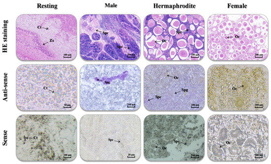 - Liu, B.Z.; Cong, J.J.; Su, W.Y.; Hao, Z.L.; Sun, Z.H.; Chang, Y.Q. Identification and functional analysis of the Dmrt1 gene and the SoxE gene in the sexual development of sea cucumber, Apostichopus japonicus. Front. Genet. 2023, 14, 1097825. [Google Scholar] [CrossRef] [PubMed]