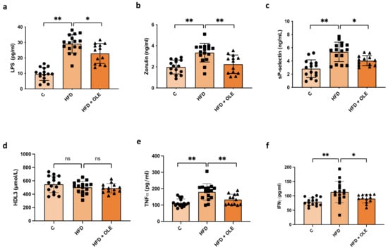 2.1. Oleuropein Reduces HFD-Induced Increased Platelet Activation and Higher Concentrations of Circulating LPS