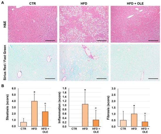 2.2. Oleuropein Reduces HFD-Induced Hepatic Steatosis, Lobular Inflammation, and Fibrosis
