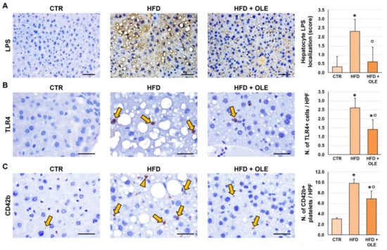 2.3. Oleuropein Reduces HFD-Induced Hepatic LPS Localization and TLR4+ Macrophage Increase