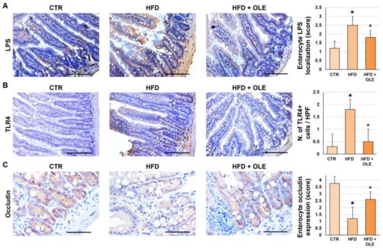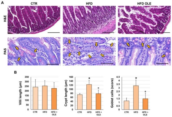 2.5. Oleuropein Reduces HFD-Induced Intestinal Morphological Derangements