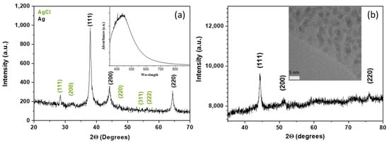 The XRD pattern of the bio-synthesized AgNPs highlights the presence of cubic Ag metal nanoparticles as the main phase (Figure 1a), with the characteristic diffraction peaks at 38.15°, 44.30°, and 64.52° that correspond to correspond to the (111), (200), and (220) reflections, respectively (ICDD file no. 00-087-0718). The UV-Vis absorption spectrum also confirms the presence of AgNPs with a maximum absorption at 471 nm (inset Figure 1a). The XRD pattern also shows the presence of trace amounts of AgCl secondary phase with X-ray diffraction peaks of very low intensity at 27.88°, 32.26°, 46.25°, 54.85°, and 57.50° that correspond to the (111), (200), (220), (311), and (222) reflections (ICDD file no. 00-001-1013). AgCl is a well-known secondary phase commonly produced when using plant extract-mediated synthesis [,]. The presence of AgCl secondary phase in trace amounts is not detrimental for the present study, which focuses on the development of a methodology to assess the antimicrobial properties of metal nanoparticles. In addition, AgCl nanoparticles are known to exhibit antimicrobial properties []. The X-ray diffraction pattern of Figure 1b reveals that cobalt metal nanoparticles (CoNPs) exhibit a face-centered cubic (Fm3m) crystal structure (a = 3.5447 Å), and a crystallite average diameter of 3 nm was calculated using the Scherrer equation []. HRTEM study confirmed the nanosize of the cobalt metal nanoparticles and their high crystallinity.