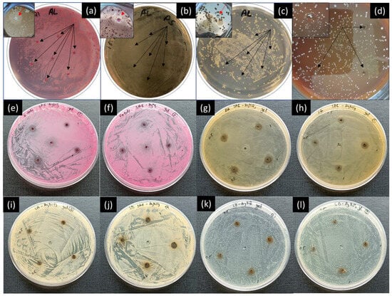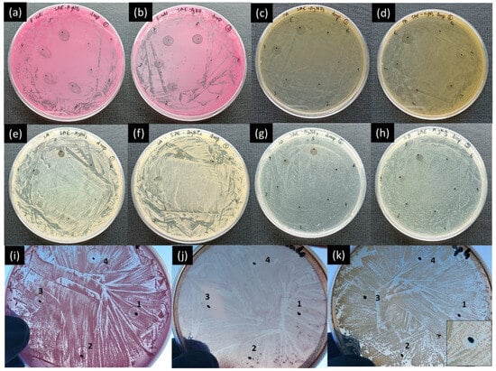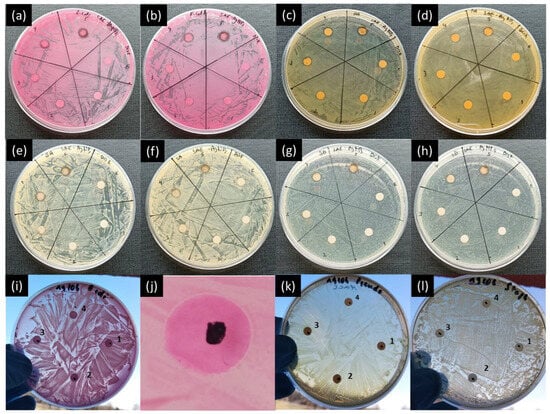 To assess the validity of the method and compare it with the results obtained from the other assays, SAE-AgNPs were mixed with Aloe Vera gel, considering the weight ratios of 0.5 wt% and 1 wt%. Two drops of each concentration were added to the Petri dishes (Figure 5e–l), and one drop of pure Aloe Vera gel was also added to the center as a negative control.