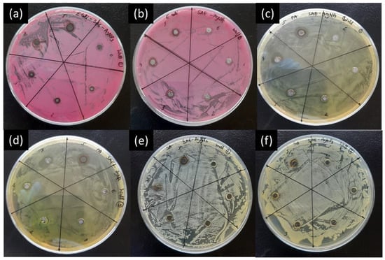 A well diffusion assay was applied for comparison with the other conventional diffusion methods and the Aloe Vera gel diffusion assay. Figure 3 shows similar trends with an increase in the inhibition area with the increase in SAE-AgNP concentrations in PBS. However, the tests highlight differences in inhibition areas with the same bacterial strain, with larger inhibition areas for lower nanoparticle concentrations, or changes in inhibition area shape (i.e., other than circular). In the case of tests against E. coli (Figure 3a), the SAE-AgNP concentration of 0.8 mg/mL does not show an inhibition area compared to the concentrations of 0.5 and 1 mg/mL, which exhibit antimicrobial properties. In the case of P. areruginosa (Figure 3c), a regular increase in the inhibition area with the increase in SAE-AgNP concentration is visible, but the shape is irregular for 0.8 mg/L. A similar trend is visible in Figure 3d, but the shape of the inhibition area is oblong for 1 mg/L. This shows a lack of regularity in the assay that can mainly be attributed to pipetting and the nature of metallic nanomaterials. In the case of Gram-positive bacteria, the well diffusion assay did not show any antimicrobial properties (Figure 3e,f). The well diffusion assay shows that SAE-AgNPs only exhibit antimicrobial properties against Gram-negative bacteria. However, the drop diffusion assay highlighted clear antimicrobial properties against all strains from SAE-AgNP concentrations of 0.8 mg/L (Figure 2). These results demonstrate that the well diffusion assay method does not appear suitable to assess the antimicrobial properties of metal nanoparticles, but is rather more adapted for testing drugs [].