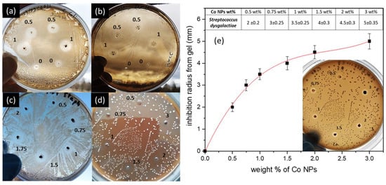 Antimicrobial activities of cobalt metal nanoparticles (CoNPs) mixed with Aloe Vera gel against (a) E. coli, (b) P. aeroginosa, and (c) S. aureus; places marked 0.5, 0.75, 1, 1.5, 1.75, and 2 correspond to concentrations of 0.5, 0.75, 1, 1.5, 1.75, and 2 wt% in the drop of 20 μL of gel added; (d) S. dysgalactiae places marked 0.5, 0.75, 1, 1.5, 2, and 3 correspond to concentrations of 0.5, 0.75, 1, 1.5, 2, and 3 wt% in the drop of 20 μL of gel added; (e) inhibition radius depends on the amount of CoNPs in the Aloe Vera gel from (d).