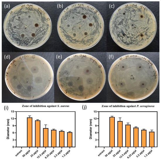 For the drop diffusion assay, the antimicrobial properties of SAE-AgNPs are confirmed using higher concentrations, and a regular increase in the inhibition zone is visible with an increase in the SAE-AgNP concentration (Figure 7a,b,d,e). For S. aureus, a stabilization of the inhibition zone size at a diameter of 7 mm is observed at a concentration of 25 mg/mL (Figure 7i). This suggests that increasing the nanoparticle concentration to 50 mg/mL does not improve their antibacterial efficiency. In the case of P. aeruginosa, the inhibition zone size reaches a maximum diameter of 12 mm for a concentration of 50 mg/mL (Figure 7j). For the Aloe Vera gel diffusion assay, the inhibition radius increases with the increase in SAE-AgNP content in the gel against both S. aureus and P. aeruginosa (Figure 7c,f). Similar to the drop diffusion assay, the Aloe Vera gel diffusion assay reveals that SAE-AgNPs exhibit higher antimicrobial properties against P. aeruginosa than S. aureus. This comparison shows that both methods produce similar trends and results, and that the drop diffusion method validates the Aloe Vera gel diffusion assay in the case of SAE-AgNPs. The Aloe Vera gel diffusion assay can then also be applied to assess the antimicrobial properties of silver metal nanoparticles and can be extended to other metallic nanomaterials.