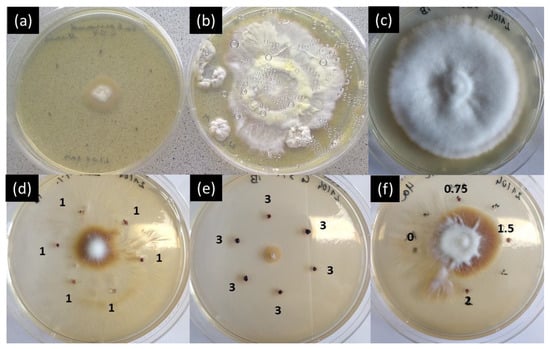 Inhibition area against M. canis seeded in the center of the plate (a) surrounded by six 10 μL drops (marked with a black dot) of PBS containing 400 mg/L of CoNPs; (b) control plate; (c) control plate with pure Aloe Vera gel drops; (d,e) antifungal activity of Aloe Vera gel drops containing weight ratios of 1 wt% and 3 wt% of CoNPs against M. canis; (f) antifungal activity of CoNPs against M. canis; places marked 0, 0.75, 1.5, and 2 correspond to concentrations of pure Aloe Vera gel and 0.75 wt%, 1 wt%, and 2 wt% CoNPs added in 20 μL drops.