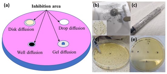It is possible to assess the antimicrobial properties of engineered nanoparticles using disk diffusion susceptibility tests []. The Kirby–Bauer method can be applied, but only in the case of nanomaterials that tend to release toxic and highly diffusive ions or organic molecules (i.e., soluble species) into the cultured growth medium. It is possible to assess the antimicrobial properties of AgNPs because they can release silver ions through dissolution. This method can only assess antimicrobial properties based on ion diffusion rather than the physical interaction of the microorganisms with the nanomaterials. However, the disk diffusion method relies on the amount of solution added to the diffusion disk, which is highly dependent on the homogeneity of the prepared solution. For these reasons, the possible agglomeration of nanoparticles or fast sedimentation of the tested nanomaterial during the preparation of the solution must be avoided.