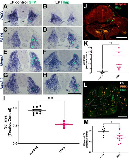 We examined the effects of Shh deprivation on early sclerotome development, by misexpression of the high affinity and selective Shh antagonist H hip1 []. Ventral halves of flank-level epithelial somites were focally electroporated in embryos aged 23–25 somite pairs. A day later, the sclerotomal markers PAX1, PAX9, as well as Meox2 and Nkx3.2 that additionally identify the DM, were normally expressed in treated compared to control sides or to control GFP-treated embryos (Figure 1A–H) [,,,,]. However, the treated sclerotomes exhibited a notable reduction in size (Figure 1A–I), along with a decrease in the adjacent DMs (Figure 1F,H), consistent with previous findings [,].