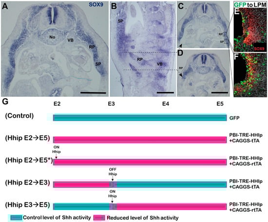 Skeletal components apparent in the flank region of quail embryos at E5. (A–D) Transverse (A,C,D) and sagittal (B) sections in situ hybridized for SOX9, showing, at E5, the presence of vertebral bodies (VB) surrounding the notochord (No), rib primordia (RB) entering the LPM, and sternal primordia (SP) ventrally located. (E,F) Electroporation at E2 of control GFP (green) to the LPM reveals in (E); no contribution to the Sox9-immunoreactive RP (red), yet significant colonization of the SP with cells co-expressing GFP and Sox9 (F). (G) Schematic representation of the experimental protocol implemented for conditional Hhip misexpression. * denotes the second method for Hhip misexpression between E2–5. See Results and Methods for further details. Bar = 300 μM.