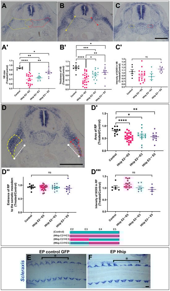 Effects of conditional Shh inactivation on development of various skeletal components (A–D) E5 transverse sections in situ hybridized for SOX9, depicting measurements of VB size (A), VB thickness (B), intensity of SOX9 in VB (C), and RP size; extent of entrance into the LPM; and intensity of SOX9 in RP (D); performed in treated (red) compared to control sides (yellow). (A′,B′,C′,D′,D″,D‴) Quantification of the above parameters as depicted in each graph. See Methods for further details. n = 6–24 embryos per treatment were analyzed as shown in the scatter plots. * p < 0.004, ** p < 0.002, *** p < 0.0003, **** p < 0.0001, ns, not significant. (E,F) Frontal sections in situ hybridized for Scleraxis with asterisks depicting electroporated region. Bar = 300 μM.