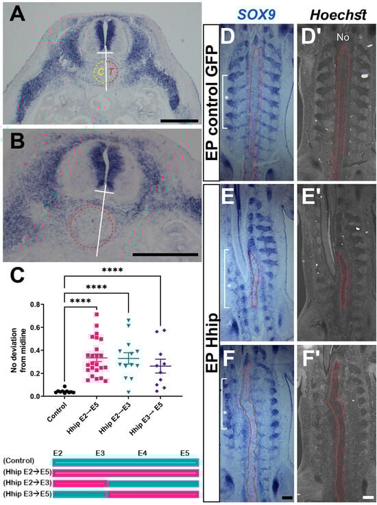 Notochord deviation from the midline in embryos with reduced Shh activity. (A,B) Transverse sections at E5 in situ hybridized for SOX9 depicting the mode of measurement of notochord deviation comparing treated (area of notochord defined by red stippling) with control (area of notochord surrounded by yellow stippling) in control (A) and treated (B) embryos. See Methods for further details. (C) Quantification of notochord deviation showing significant effects of each experimental paradigm compared to control. n = 10, 24, 13, and 10 embryos analyzed for control, or Shh deprivation between E2–5, E2–3 or E3–5, respectively; **** p < 0.0001. (D–F) Frontal sections in situ hybridized for SOX9 (D–F) and counterstained with nuclear Hoechst (D′–F′). A straight notochord is apparent in control (D,D′), whereas undulated notochords are seen in presence of Hhip (delimited by red dashed area). Electroporated region delimited by a white line and *. This sometimes resulted in frontal sections traversing both neural tube and notochord along the rostro-caudal axis (E,E′). Bar = 300 μM.