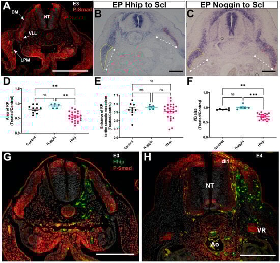 Lateral patterning of the paraxial mesoderm is induced by BMP signaling from the LPM [,] and treatment with BMP is able to generate LPM from segmental plate tissue []. Supporting this, both BMP4 mRNA [] and BMP activity (this study) exhibit a decreasing ventro-dorsal gradient within the somatic layer of the LPM. Intriguingly, we observe that BMP activity reaches its peak in the VLL of the DM, despite the neighboring area showing low activity, and even though this region does not produce BMP family members (such as BMP4, 7, or 2) []. The precise mechanism underlying the heightened responsiveness of the VLL to BMP remains unclear. It is possible that the VLL responds to BMPs produced in the overlying ectoderm, albeit inhibition of BMP in the LPM with no ectodermal involvement profoundly affected this epithelium. In this context, it is worth noting a similar pattern of Shh/Gli activity in mice, where a diminishing medio-lateral gradient was identified in the sclerotome, with a peak of activity observed in the myotome, distant from the source of factor synthesis []. In this scenario, positive modulators of Shh activity were produced in the myotome, suggesting that low levels of the factor can translate into high activity levels in the presence of appropriate pathway regulators. Whether a similar situation applies for BMP signaling vis-a-vis the lateral DM remains to be examined. Along this line, Shh signaling impacts expression of FGF8 in the myotome, including its hypaxial domain, and misexpression of FGF8 causes rib abnormalities [,]. Thus, myotomal FGF8 might integrate signals emanating from Shh and BMP to modulate aspects of vertebral formation.