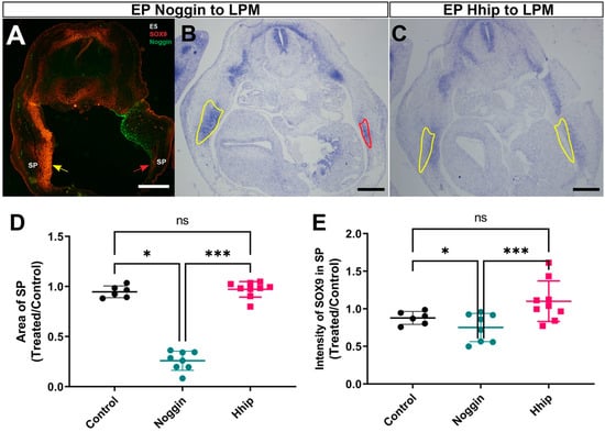 Inhibition of BMP activity in the LPM, unlike abrogation of Shh activity, reduced the size of the sternal primordium (A–C) Transverse sections at E5 of embryos unilaterally electroporated with Noggin (A,B) or Hhip (C) to the LPM. In (A,B), note dramatic reduction of the SP revealed by Sox9 immunostaining (A, red arrowhead vs. yellow arrow) or in situ hybridization [(B), area encircled by a red line compared to control SP delimited by yellow]. (C) Hhip has no effect on SP size. (D,E) Quantification of SP area and SOX9 intensity showing reduced size only upon Noggin treatment. n = 6, 8, 9 embryos for control, Noggin or Hhip, respectively. * p < 0.05, *** p < 0.001, ns, not significant. Bar = 300 μM.