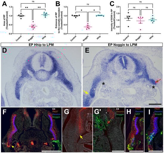 Reduced RP size and ingression into the LPM due to BMP deficiency are linked to hypaxial muscle growth failure through direct impact on the lateral DM epithelium. (A–C) Quantification of RP area (A), extent of entrance into the LPM (B), and intensity of SOX9 expression in E5 embryos electroporated at E2 with either Noggin or Hhip to the LPM. Only Noggin caused a significant reduction of RP size and LPM ingression. n = 5 embryos for each treatment). * p < 0.05, ** p < 0.0, ns, not significant. (D,E) Transverse sections showing, in (D), no effect of Hhip on the measured parameters, and in (E), a control RP that invaded the LPM in close association to the coelomic membrane (yellow arrow, left side), whereas upon Noggin transfection (right side), a smaller RP stopped close to the upper border of the coelomic cavity (*) and failed to progress ventralward (red arrow). (F) Transverse section at E4 illustrating the presence of a VLL (yellow arrow) in the control side but no VLL (red arrow) in the Noggin-treated side where desmin immunoreactive muscle (blue) reaches the distal tip. (G,G′) Transverse sections through an embryo at E5 illustrating the ingression of the control myotome into the LPM (G, yellow arrow) and the myotome in the treated side remaining in the epaxial-hypaxial boundary (G′, red arrow, * depict the upper coelomic border). (H,I) Electroporation of control GFP into the dorso-lateral somite at E2 displays, 2 days later, the presence of many GFP+ cells in the VLL, while others colonize the myotome. (I) Upon Smad6 transfection, virtually all labeled VLL progenitors exit the Pax7+ epithelium and differentiate into desmin+ muscle. (H,I), Bar = 200 μM; (D–G′), 300 μM.