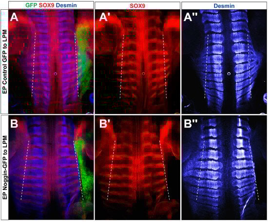 Rib primordia and hypaxial muscles fail to enter the LPM in absence of BMP signaling. (A,B) E5 embryos electroporated at E2 with either control GFP (A–A″) or Noggin-GFP (B–B″) to the LPM. Following fixation and immunostaining, embryos were eviscerated and prepared as an open book with their medial side pointing laterally. Images depict dorsal views of the wholemount preparations stained for GFP, Sox9, and desmin, illustrating, in controls, the entrance of both RP and hypaxial myotomes into the LPM (co-expression of GFP/desmin/Sox9 lateral to the dotted lines). In contrast, inhibition of BMP signaling in LPM prevented the ingression of both ribs and hypaxial muscles into the somatic mesoderm compared either to the intact contralateral side or to control GFP-treated embryos (note, in the treated side in (B–B″), no overlap between Sox9/desmin and GFP, e.g. no ribs or muscle tissue apparent lateral to the dotted line, see also Figure 7 for transverse sections). Dotted lines mark the epaxial/hypaxial boundary. n = 6 and 16 embryos for control and Noggin, respectively, that showed a similar phenotype. Rostral is to the top.