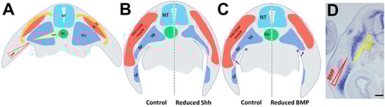 - Liem, K.F., Jr.; Jessell, T.M.; Briscoe, J. Regulation of the Neural Patterning Activity of Sonic Hedgehog by Secreted BMP Inhibitors Expressed by Notochord and Somites. Development 2000, 127, 4855–4866. [Google Scholar] [CrossRef] [PubMed]