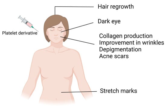 Platelet concentrates carry various growth factors contained in alpha and dense granules. Alpha granules possess seven important growth factors: platelet-derived growth factors (PDGFaa, PDGFbb, and PDGFab), transforming growth factor beta (TGFβ1 and 2), epithelial growth factor (EGF), and vascular endothelial growth factor (VEGF) [1]. These growth factors regulate processes such as cell proliferation, matrix remodeling, differentiation, angiogenesis, and chemotaxis. Dense granules contain bioactive substances such as ADP, ATP, serotonin, and calcium, which, after activation and subsequent platelet degranulation, increase membrane permeability and stimulate regenerative processes, promoting vascular remodeling and immunomodulation through the release of signaling molecules [1,2,3,4]. In addition to these advantages, since platelet-derived bioproducts are autologous products, they do not present the risk of allergic induction and have been extensively used in various medical specialties, including cardiac surgery, oral surgery, orthopedics, sports medicine, and facial plastic surgery. Furthermore, these bioproducts have undergone a significant upsurge in dermatology and aesthetic procedures in recent years [5,6,7]. These biological products have served as regenerative agents for several years, leveraging growth factors derived from peripheral blood to induce vascularization in different tissues. Upon activation, these cells form a fibrin network in a liquid state, releasing a plethora of growth factors that foster tissue regeneration by stimulating cell proliferation, differentiation, and migration and the production of collagen and elastin [8]. These effects have been explored in aesthetic medicine for different purposes, such as alopecia treatment, scar treatment, surgery, and wound healing (Figure 2). These products may also be used as adjuvants in other treatment modalities, including ablative and nonablative laser therapy, bipolar radiofrequency, and microneedling [9,10,11,12,13,14].