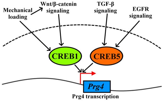 - Zhang, C.-H.; Gao, Y.; Jadhav, U.; Hung, H.-H.; Holton, K.M.; Grodzinsky, A.J.; Shivdasani, R.A.; Lassar, A.B. Creb5 establishes the competence for Prg4 expression in articular cartilage. Commun. Biol. 2021, 4, 332. [Google Scholar] [CrossRef]