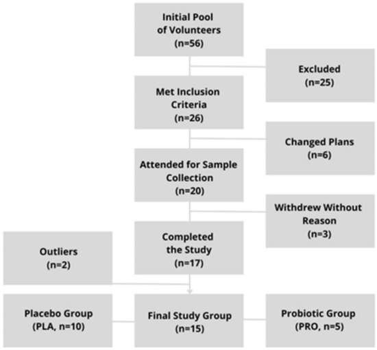 Fifteen participants were selected for the analysis of primary and secondary outcomes with 10 receiving a placebo (PLA) and 5 receiving the probiotic (PRO) treatment. The randomization scheme was generated using a computer-based algorithm (block randomization with block size of four). The randomization was generated by the manufacturer of the probiotic under study. The distribution of participants between the placebo group (n = 10) and the treatment group (n = 5) in the final study group was impacted by elevated dropout rates and the presence of outliers, which were predominantly in the treatment group. While our objective was to sustain equal group sizes, we prioritized preserving the integrity of the randomization process.