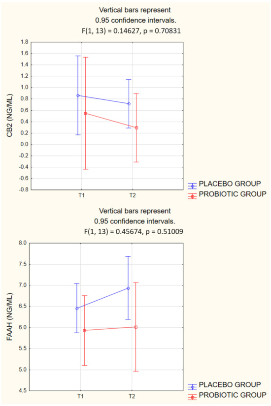 Graphs of two-way ANOVA for CB2 and FAAH levels in groups before and after probiotic therapy or placebo treatment.
