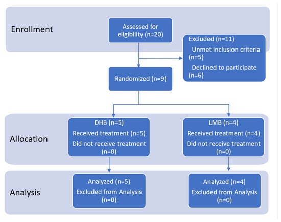 Out of twenty participants who were screened for this pilot study, five did not meet the inclusion criteria, and six declined to participate; therefore, nine participants were randomized to parallel treatments in a 2-arm pilot study (Figure 1).