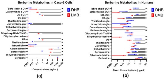 Comparison of ranges (min to max) of concentrations of berberine metabolites between dihydroberberine (DHB, blue) and LipoMicel® Berberine (LMB, red). (a) Berberine metabolites in Caco-2 cells after 2 h of incubation. (b) Berberine metabolites in human whole blood. Cmax data presented. Dark bars indicate the mean concentrations observed while light-colored bars indicate the range of concentrations observed. * Indicates q ≤ 0.05 with a false discovery rate of 5% using the paired t-test (Caco-2 data) or unpaired Mann–Whitney test (human data). # indicates the metabolite was not detected in one treatment. Glu = glucuronide. See Table S1 for other compound abbreviations.