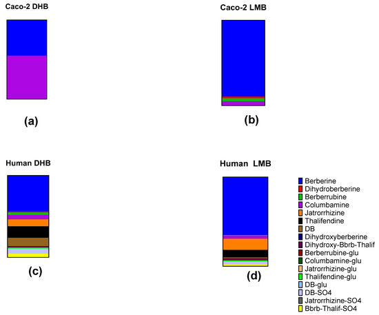 Except for dihydroxyberberrubine and berberrubine glucuronide, blood from participants in the DHB treatment group provided concentrations that are several folds higher than that from the LMB treatment group (Table S2). However, when viewed proportionally, a greater fraction of total metabolites in the blood of participants in the LMB treatment group remained as berberine compared to the DHB treatment group (Figure 3c,d). This is consistent with the higher proportion of berberine observed in LMB-treated Caco-2 cells compared to DHB-treated cells.