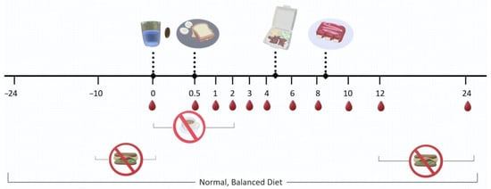 On the day of the study, participants arrived after an overnight fast, and then were given a small cup labeled with their name containing one of two randomly preassigned interventions. A baseline blood sample (t = 0) was collected from each participant prior to the intervention, and subsequent blood samples were collected at 0.5, 1, 2, 3, 4, 6, 8, 10, 12, and 24 h post-intervention. Participants were given a standardized breakfast consisting of a ham and cheese sandwich with a hardboiled egg, as well as a standardized lunch and dinner after 4 h and 8 h, respectively (Figure 4).