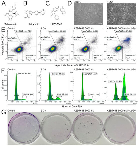 Kinase Inhibitors, cell lines and methods. (A) Talazoparib (50 nM), (B) niraparib (2500 nM) and (C) AZD7648 (5000 nM) were evaluated, each both with and without IR. (D) Microscopic images of SBLF9 and HSC4 are depicted representatively for the two healthy fibroblast cell lines and the seven HNSCC cell lines examined. The white bar equals 100 µm. (E) Representative scatter plot of the flow cytometric measurement of apoptosis and necrosis induction by Annexin V and 7AAD in UM-SCC-47. (F) Representative histograms of the Hoechst 33342-stained and flow cytometrically analyzed cell cycle distribution in UM-SCC-47 cell line. (G) Representative Petri dishes for colony formation assay containing Cal33 colonies. For all methods, the displayed samples are control, 2 Gy, AZD7648 5000 nM and AZD7648 5000 nM + 2 Gy. For all three methods, half of the samples were irradiated with 2 Gy IR, 3 h after the inhibitors were added to all samples. After a further 48 h, the inhibitors were removed, and either flow cytometric measurements were performed or standard medium was added to the colony formation assay.