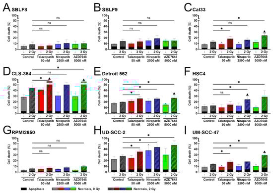 Flow cytometry analysis of apoptosis and necrosis. Healthy fibroblast cells (A) SBLF8, (B) SBLF9, HPV-negative HNSCC cells, (C) Cal33, (D) CLS-354, (E) Detroit 562, (F) HSC4, (G) RPMI2650 and HPV-positive HNSCC cells, (H) UD-SCC-2, (I) UM-SCC-47 were treated either with talazoparib (50 nM), niraparib (2500 nM) or AZD7648 (5000 nM) or combined with 2 Gy IR. After 48 h, apoptosis (Annexin V) and necrosis (7AAD) were measured using flow cytometry. Apoptosis is presented in black, necrosis is color-coded for different inhibitors, and irradiated samples are hatched. Each value represents mean ± SD (n ≥ 4). Combined treatments and KI alone were compared to IR alone, and significant changes from IR alone are indicated for combined treatments by asterisks above the corresponding line and for KI alone by small asterisks above the respective bar. The abbreviation “ns” above the corresponding line represents changes that are not significant. A triangle represents supra-additivity. Significance was determined using a two-tailed Mann–Whitney U test with * p ≤ 0.05.