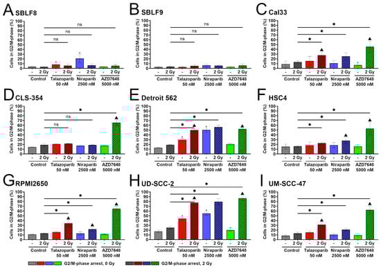 Flow cytometry analysis of cell cycle distribution. Fraction of G2/M-phase arrest. Healthy fibroblast cells (A) SBLF8, (B) SBLF9, HPV-negative HNSCC cells, (C) Cal33, (D) CLS-354, (E) Detroit 562, (F) HSC4, (G) RPMI2650 and HPV-positive HNSCC cells, (H) UD-SCC-2, (I) UM-SCC-47 were treated either with talazoparib (50 nM), niraparib (2500 nM) or AZD7648 (5000 nM) or combined with 2 Gy IR. Incubation lasted for 48 h, and afterward, cells were stained with Hoechst, and cell cycle was analyzed using flow cytometry. Different inhibitors are displayed in color, and irradiated samples are hatched. Each value represents mean ± SD (n ≥ 4). Combined treatments and KI alone were compared to IR alone, and significant changes from IR alone are indicated for combined treatments by asterisks above the corresponding line and for KI alone by small asterisks above the respective bar. The abbreviation “ns” above the corresponding line represents changes that are not significant. A triangle represents supra-additivity. Significance was determined using a two-tailed Mann–Whitney U test with * p ≤ 0.05.