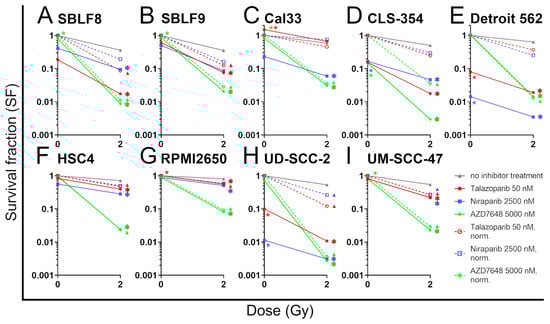 Out of the five HPV-negative cell lines we investigated, Cal33, HSC4 and Detroit 562 are p53 mut [,], while RPMI2650 is a p53 wt []. The p53 status of CLS-354 is unclear, although one study found p53 expression in CLS-354 after treatment with IFNγ, which can trigger cell cycle arrest and apoptosis, among other functions []. In our data, no clear association can be made between the p53 status of an HPV-negative HNSCC cell line and the radiosensitization capabilities of either of the two PARPis. This is stressed by the fact that even within one cell line and method, oftentimes, the radiosensitizing effects of talazoparib and niraparib are incongruent. In our experiments, the influence of the p53 status of the HPV-negative HNSCC cell lines on the radiosensitizing capabilities of PARPis was not great enough to be noticeable among the effects of various other differences between the cell lines that may influence treatment effectiveness, and it does not explain the heterogeneity found.