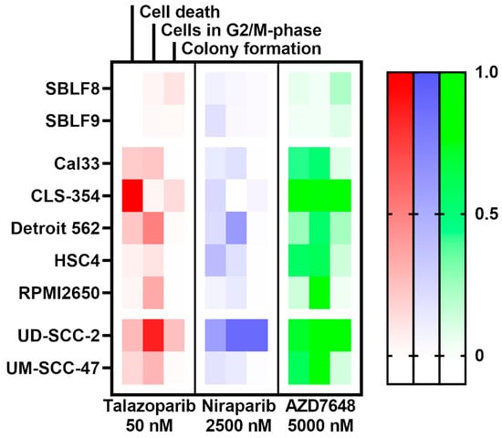 3.1. Talazoparib and Niraparib Radiosensitize HNSCC Cell Lines Heterogeneously
