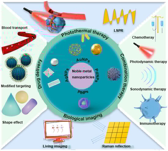 Cancer, with its multifaceted pathology, is mainly treated by traditional modalities such as chemotherapy, radiotherapy, and surgery, but is often accompanied by debilitating side effects []. Therefore, novel therapies such as photodynamic therapy (PDT), sonodynamic therapy (SDT), and photothermal therapy (PTT) have been explored in the search for more effective and less harmful therapies [,]. Among them, PTT is a promising modality that utilizes a photothermal transforming agent (PTA) to convert light energy into heat energy, thereby inducing localized thermal therapy to ablate tumor cells while minimizing collateral damage to healthy tissues []. However, the efficacy of PTT critically depends on the photothermal-converting ability of the photothermal agents, especially the nanoscale variants, which are adept at generating sufficient thermal energy upon light irradiation [,]. Therefore, the selection of effective photothermal agents is the key to promoting the efficacy of PTT. In recent years, noble metal nanomaterials have become the frontrunners in this field and won widespread attention due to their huge specific surface area and unique optical, electrical, and catalytic properties [,,]. The application of noble metals in PTT is attributed to their pronounced surface plasmon resonance, which contributes to the effective absorption of specific wavelengths of light in the near-infrared (NIR) spectrum and their subsequent conversion into thermal energy, thereby generating localized thermal therapies conducive to tumor ablation [,]. In conclusion, the flourishing development of noble metal nanoparticles in the biomedical field not only circumvents the limitations of traditional tumor therapies, but also heralds the arrival of a new, safe, and minimally invasive mode of cancer therapy.