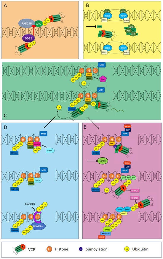 Diverse functions of nuclear VCP in the DNA repair pathways. (A) VCP in nucleotide excision repair, (B) VCP in ATR-mediated DNA damage response, (C) VCP in ATM-mediated DNA damage response, (D) VCP in non-homologous end joining and (E) VCP in homologous recombination.