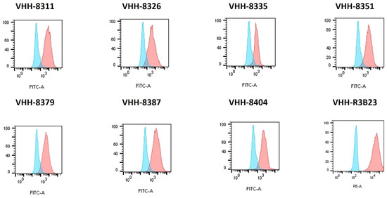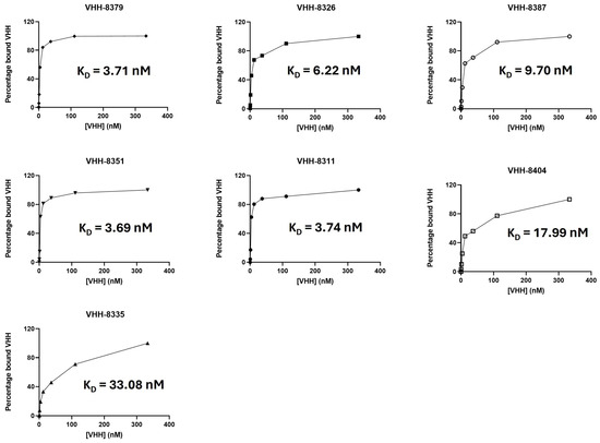 We further determined the binding capacities of these VHHs against the membrane-anchored antigen with flow cytometry and observed strong binding capacities (KD < 10 nM) for the majority of the compounds (Figure 1).