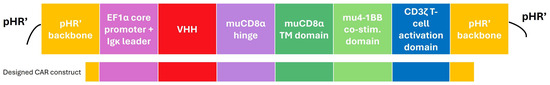 A previously described pHR’-derived lentiviral transfer plasmid was used for the generation of LVs that are capable of stably transducing target T cells with a desired genetic construct [72]. In this case, the genetic construct encoded a fully murine, second-generation CAR sequence, as depicted in Figure 2. The designed CAR encodes an EF1α core promotor and Igκ leader sequence, followed by a VHH-cloning site, a murine CD8α-derived hinge and transmembrane region, a murine 4-1BB co-stimulatory unit, and a murine CD3ζ-derived T cell activation domain (Figure 2). The complete DNA sequence of the CAR construct used is provided in Supplementary Figure S1.