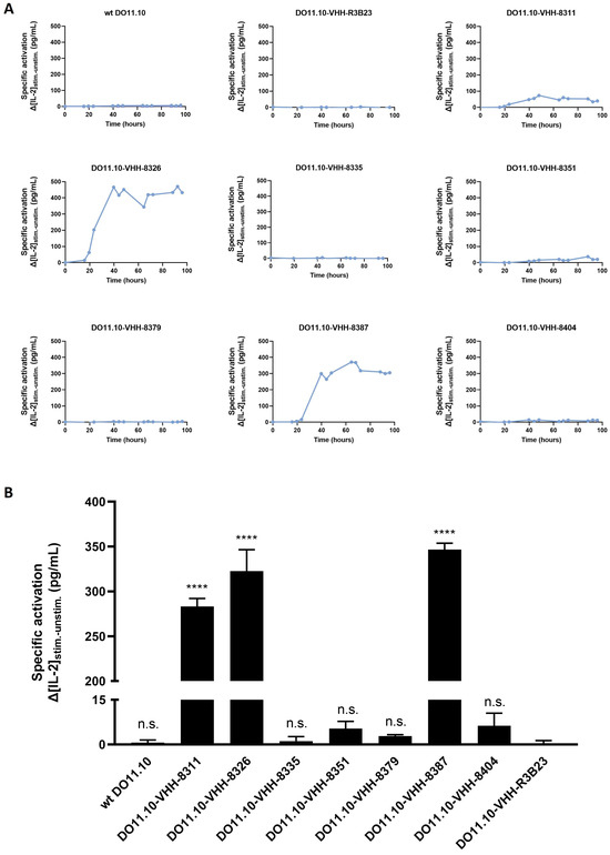 Specific CAR-T cell activation by the different VHH-CAR-transduced DO11.10 reporter T cell lines. (A): Differences in IL-2 production between (1:1) co-cultured DO11.10-VHH-CAR-T cells with 5T33MMIdpos 5T33vt cells (stimulated condition) and without stimulator cells (unstimulated condition), as determined via IL-2 ELISA over a period of 96 h (n = 1). (B): Differences in IL-2 production between 40 h (1:1) co-cultured DO11.10-VHH-CAR-T cells with 5T33MMIdpos 5T33vt cells (stimulated condition) and without stimulator cells (unstimulated condition), as determined via IL-2 ELISA. Graphs represent the mean differences in IL-2 production ± SD (n = 3). **** p < 0.0001; not significant (n.s.), p > 0.05.