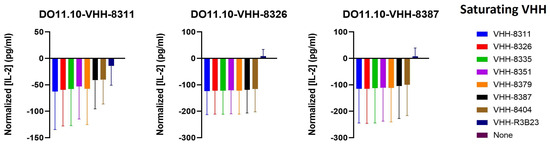 As the affinities of the VHHs for 5T33MMId were not determinant of the degree of CAR-T cell activation, we next investigated whether the specific VHH-bound epitope is a controlling factor. This is directly related to the intercellular distance between the T cell and target cell and has, therefore, been opted as an important parameter for adequate T cell activation. To verify this, we performed a series of co-culture T cell activation experiments, as described before, this time preincubating the target cells with a saturating concentration of soluble VHH. As such, the binding of a soluble VHH to an epitope similar to the one bound by the CAR-incorporated VHH causes the blocking of CAR-T cell activation, measured as a lowering of IL-2 production. Thus, if a lowering of IL-2 production is observed, the VHHs bind to an overlapping epitope. Since only VHHs 8311, 8326, and 8387 gave rise to sufficient levels of IL-2 (i.e., CAR-T cell activation), only these VHH-CAR cell lines were evaluated in competition assays. These studies showed that all VHHs, including the ones incapable of activating the CAR-T cells, interfere with and negatively affect each other’s binding to the 5T33MMId antigen, implying overlapping binding sites on the target protein (Figure 5).